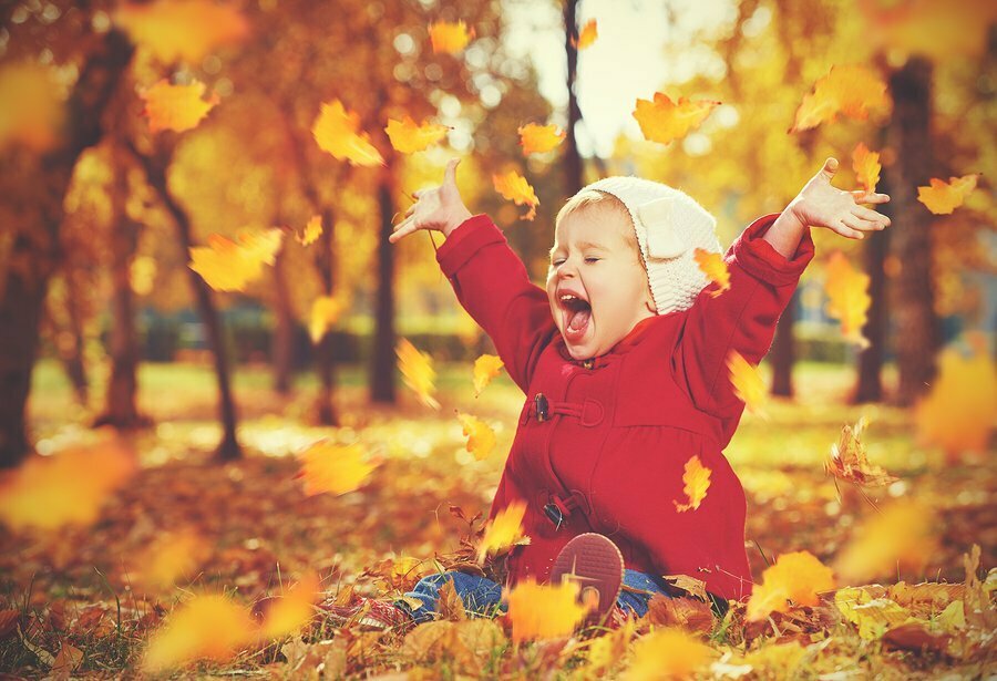 Happy Little Child, Baby Girl Laughing And Playing In Autumn