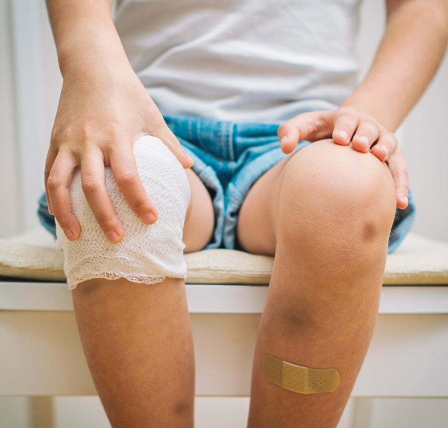 Child Knee With Adhesive Bandage, Bruise And Gauze Bandage.