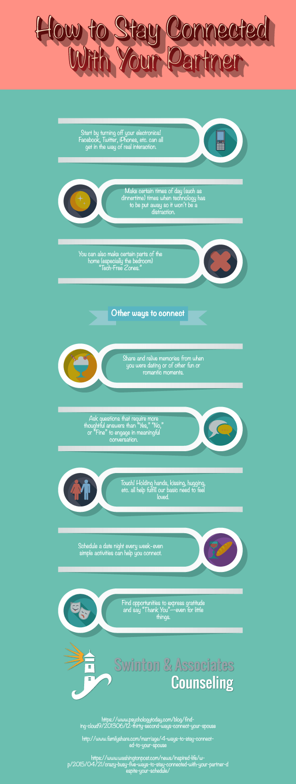 Often, our desire to be connected to our social media accounts and smartphones makes us less connected with those who are actually the most important in our lives. The following infographic offers a few suggestions on how to stay connected and build a stronger relationship.