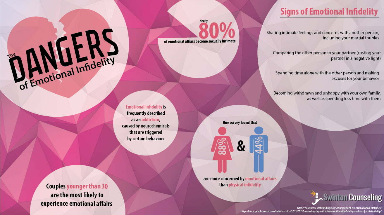 When you think of the word “infidelity,” like most people, your thoughts probably jump to physical infidelity. But the truth of the matter is that many couples in Sandy, Utah and elsewhere experience a completely different type of marital infidelity. In some cases, mental and emotional infidelity can prove even more destructive to a relationship than a sexual affair. While marriage therapy can help couples overcome these issues, partners must be willing to forgive and make changes to put these problems in the past and create a stable relationship for the future. The following infographic takes a look at some of the facts and statistics behind emotional infidelity, as well as a few warning signs that an emotional affair is taking place.